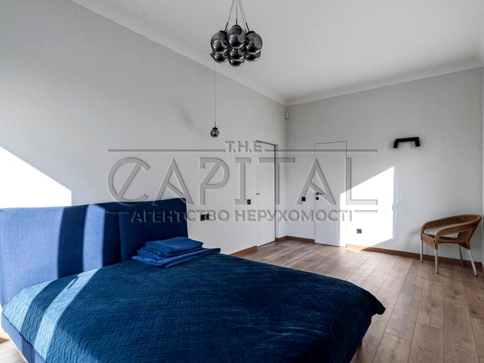 - Планування передбачає простору кухню-вітальню з панорамними вікнами, передпокій, котельню, санвузол та спальні, одна з яких має власний санвузол і гардеробну.
