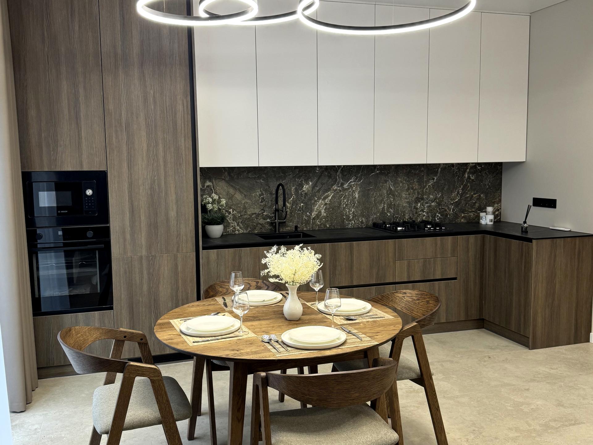 Простора кухня-вітальня з виходом у двір, поділена на зону відпочинку та обідню зону