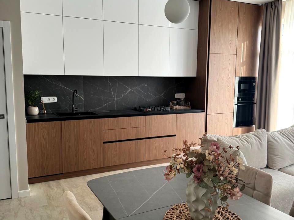 Велика кухня у поєднанні з вітальнею та виходом у двір. Ідеально підібраний інтер’єр, що дає можливість комфортно проводити час усією родиною.