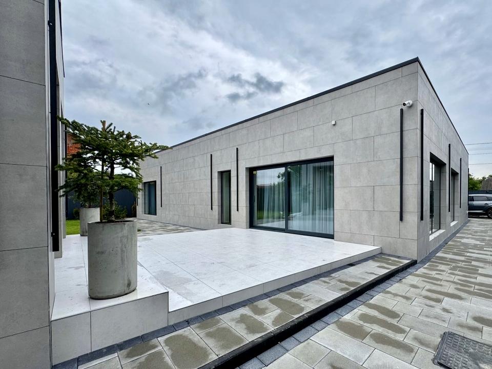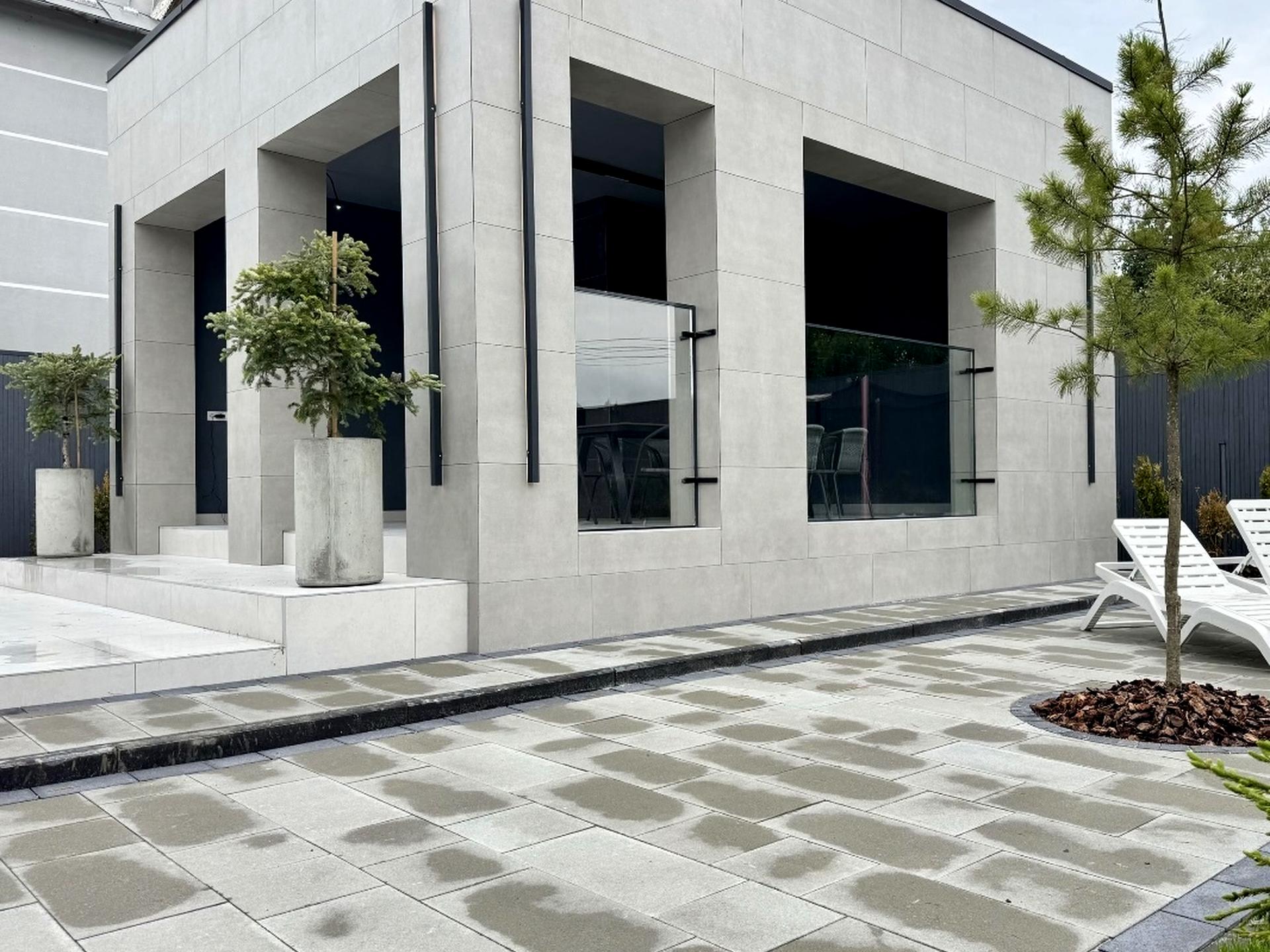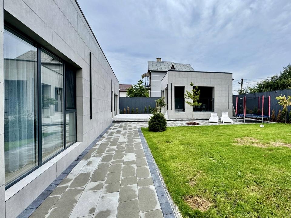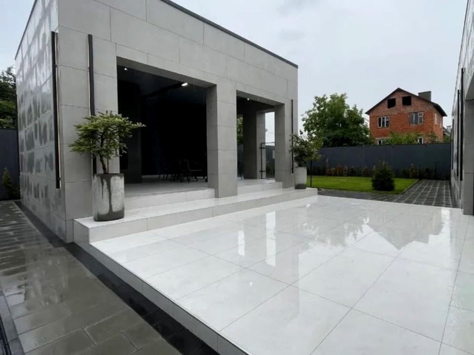 Фасад з керамограніту, експлуатований рівний дах.+ окрема бесідка з каміном. В будинку розміщена: