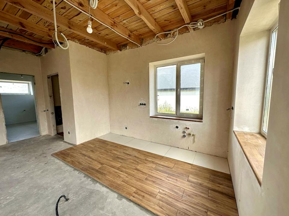 На первом этаже машинная штукатурка, разводка электрики и сантехники. В санузле кафель, теплый электро-пол, душевая кабина Ravak и смесители нужно только установить, инсталляция установлена.