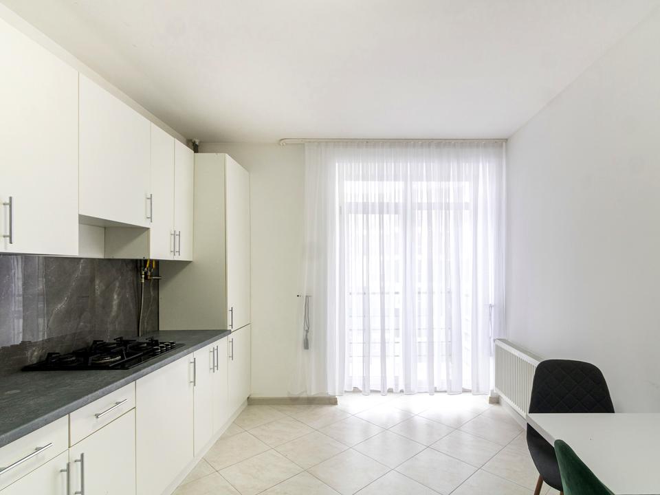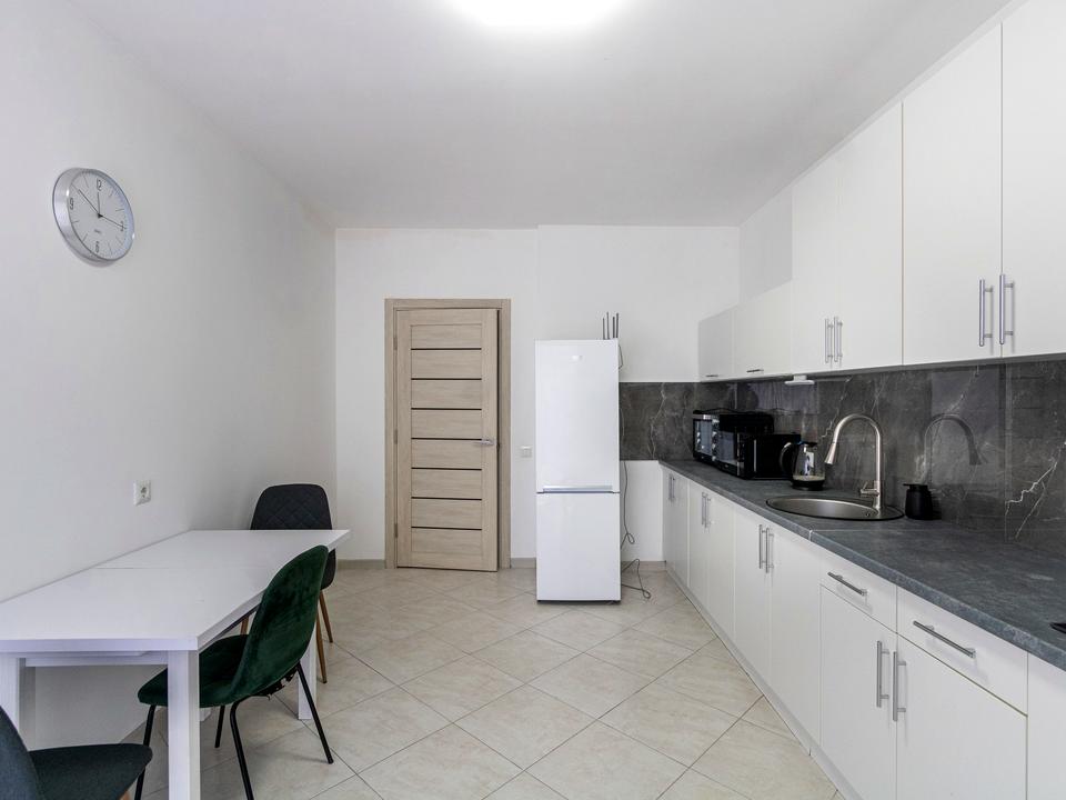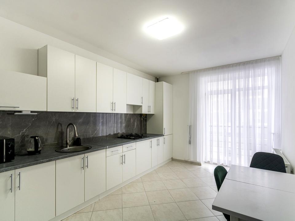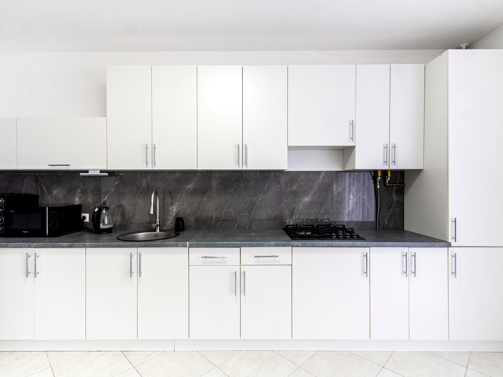 Кухня повністю обладнана необхідними меблями та побутовою технікою