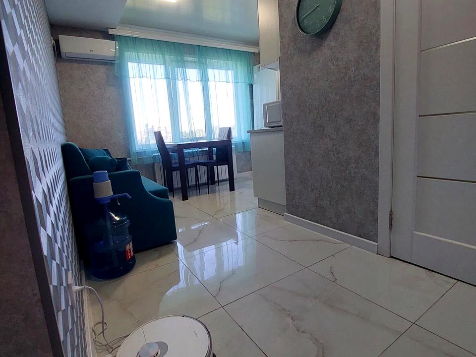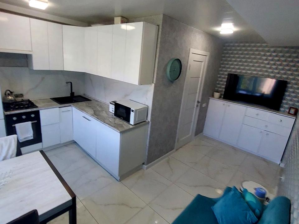 Загальна площа квартири 56 кв м. Дві окремих кімнати - простора спальна кімната та дитяча. Вітальня зона об'єднана з сучасною кухнею за рахунок розширення. На кухні встановлена сучасна техніка - посудомийка, газова поверхня, духова шафа, холодильник, мікрохвильовка.