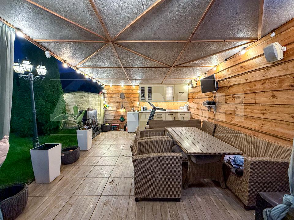 Чудесный участок , площадью 6 сот . Полностью огорожен капитальным забором . Автоматические ворота , ландшафтный дизайн , крытая беседка с барбекю-зоной , детская площадка , вечно зелёный газон с автоматическим поливом, площадка под бассейн , площадка под 3 авто, гараж на 1 машину с автоматическими воротами. Дом построен в 1 этаже , утеплён и обложен кирпичом , дорогая крыша .
