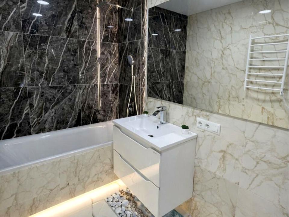 Виконано сучасний дизайнерський ремонт у світлих тонах з продуманою системою освітлення.