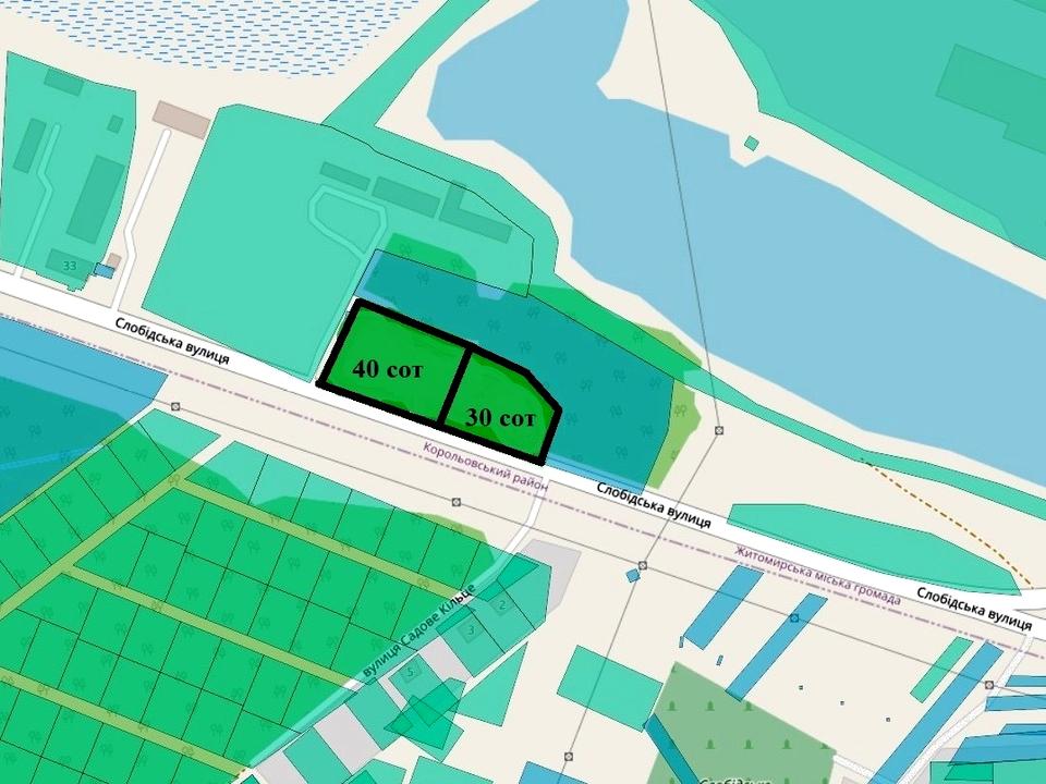 Площа – 40 соток. Ділянка фасадна (70 м), правильної прямокутної форми, рівна, з кількома заїздами з асфальтованої дороги. Ідеальне місце для реалізації бізнес-проєктів.
