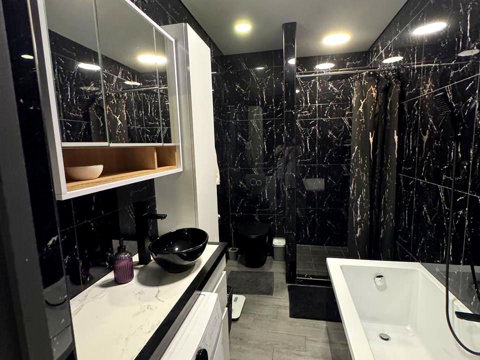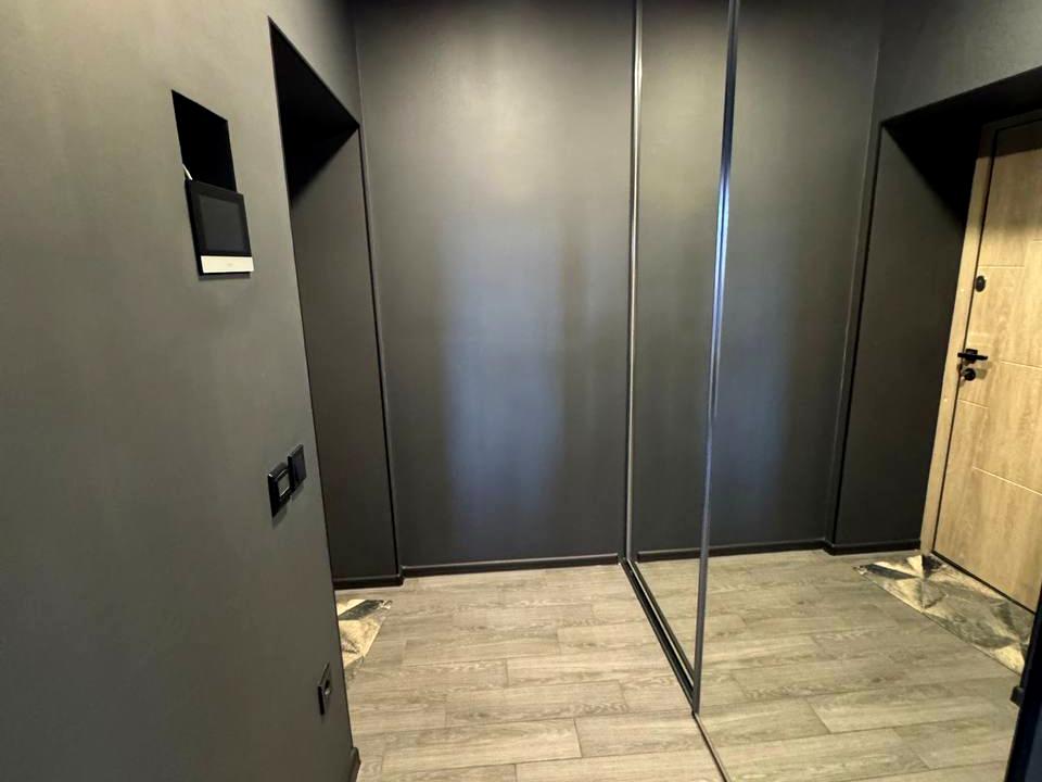 Пропонується квартира в сучасному графітовому стилі з продуманим плануванням та акцентом на темних відтінках із атмосферними підсвітками.