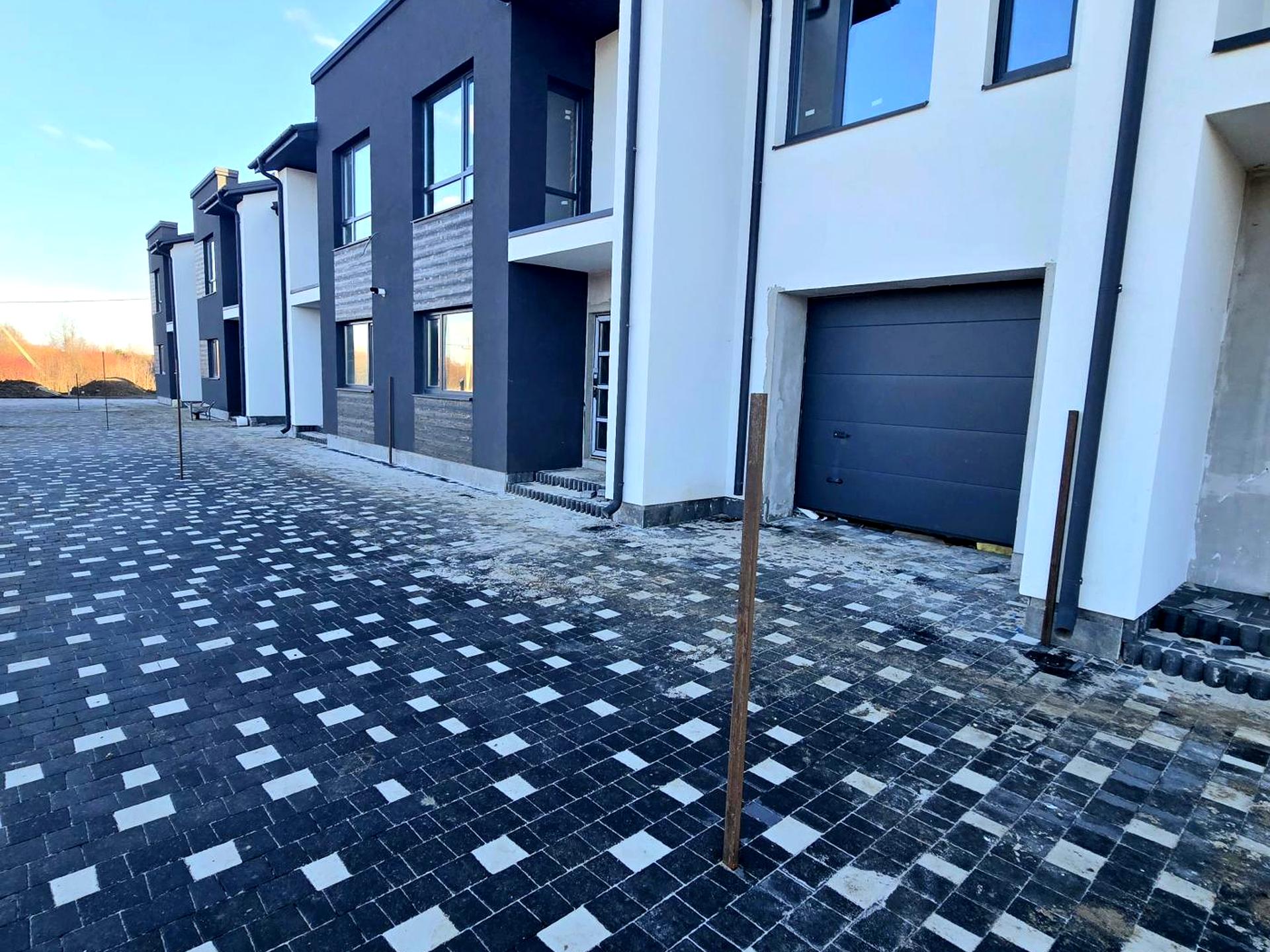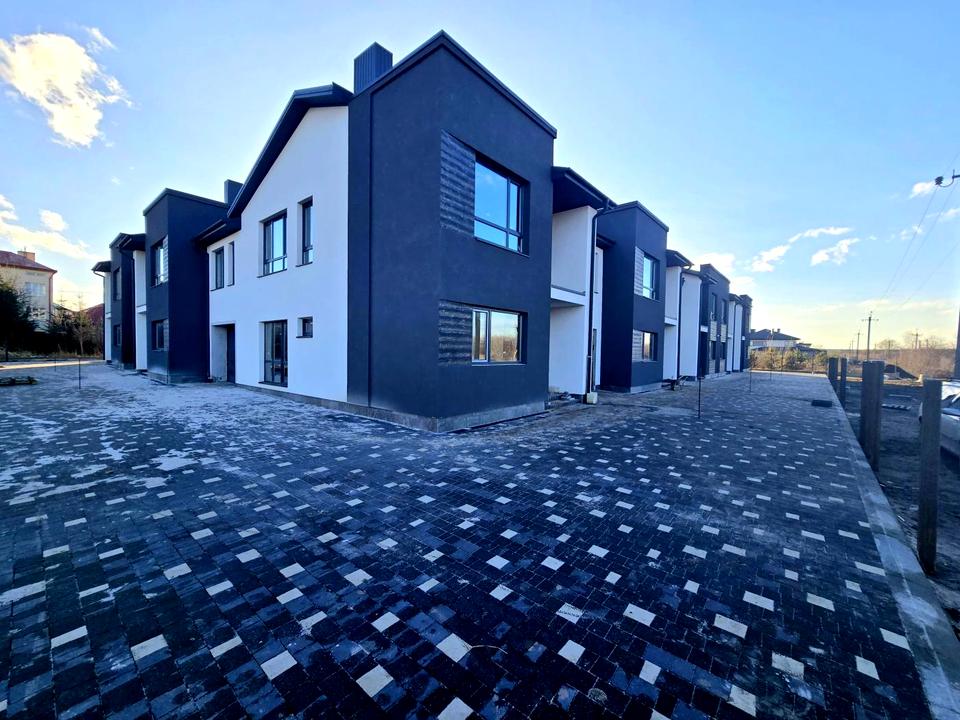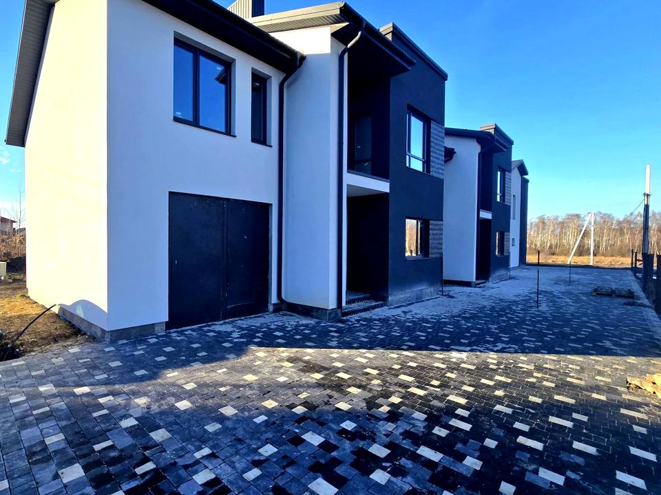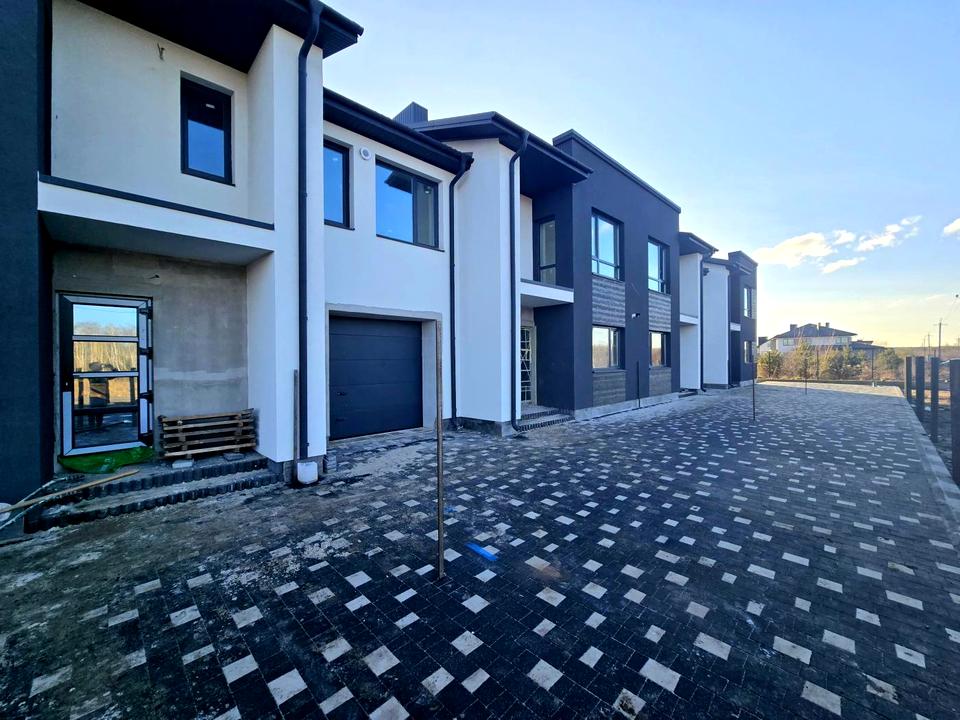 Будинок в 0-циклі, тобто ще без ремонту. Поштукатурені стіни, встановлені металопластикові вікна, вхідні двері. Будинок зовні утеплений пінопластом, покрівля металочерепиця, дах утеплений мінеральною ватою. Ворота в гараж - ролокасети, буде зроблений благоустрій навколо усіх котеджів(бруківка, дитячий майданчик). Все входить у вартість будинку.