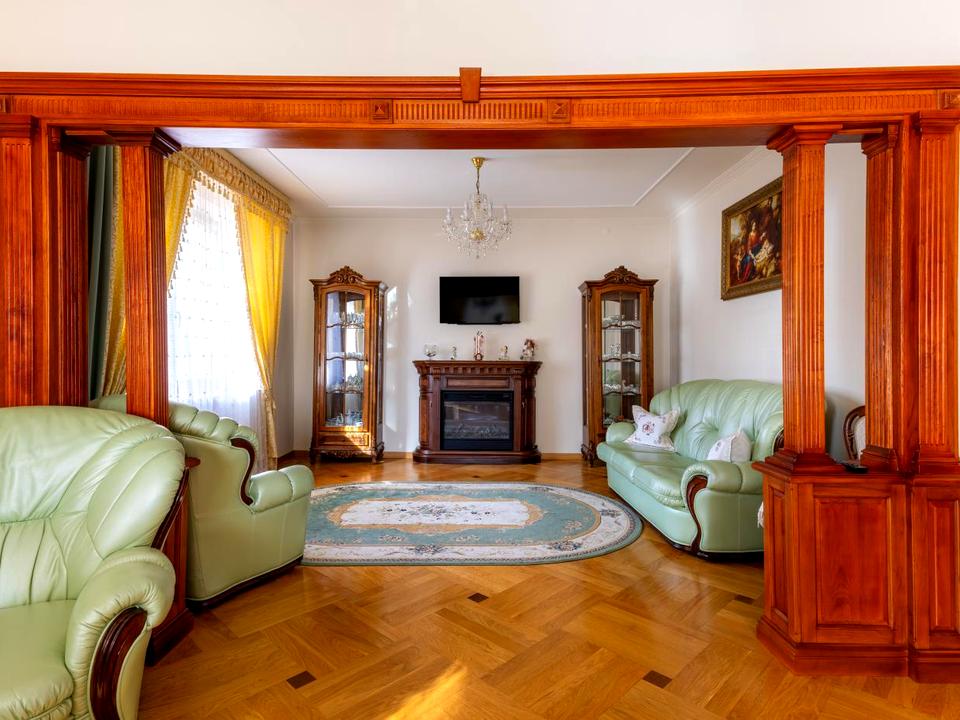 Вхідні двері, сходи та підлога — з натурального дуба.