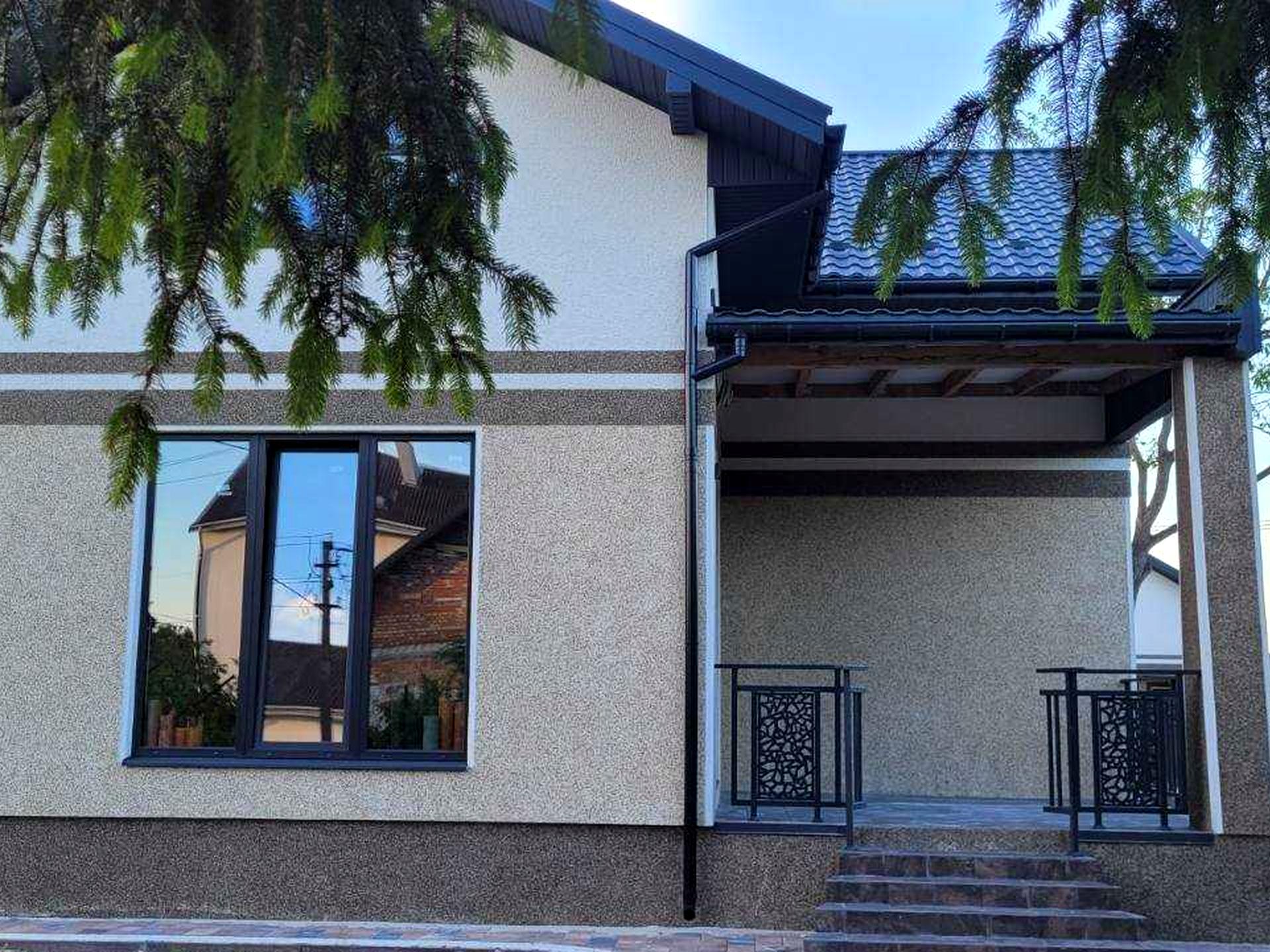 Фасад утеплений + декорований натуральним камнем . Дах металочерепиця + утеплений мінватою.