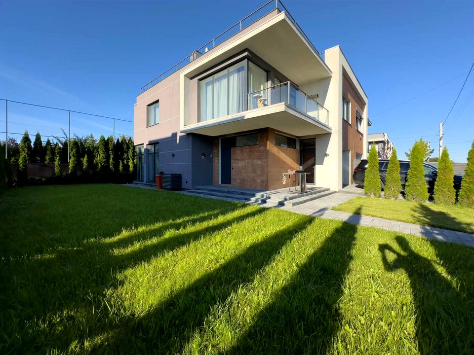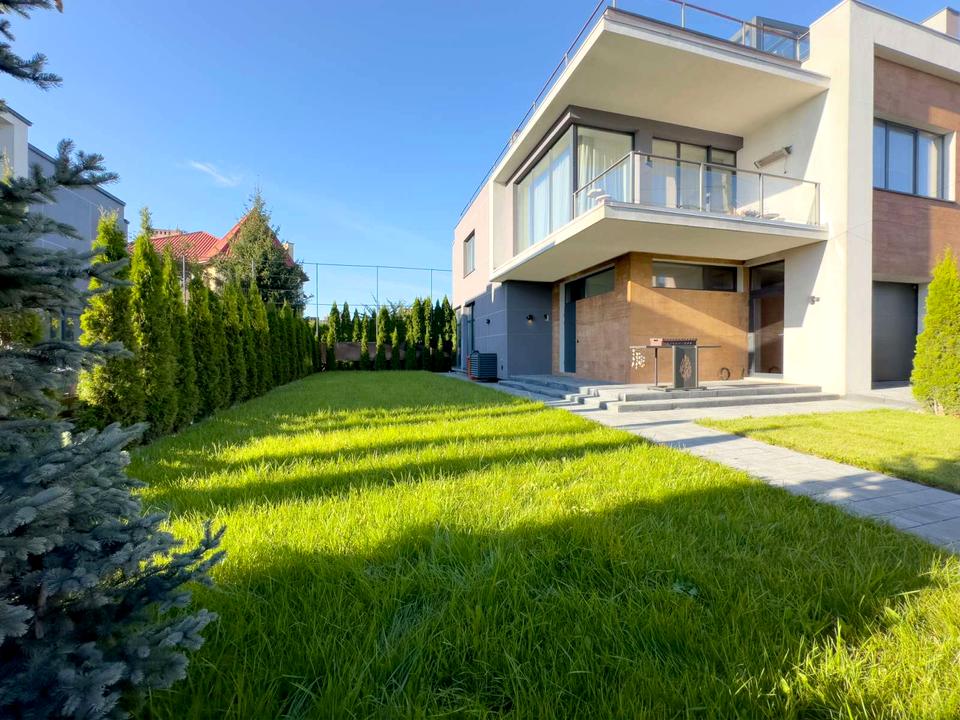 Подвір'я облаштоване газоном з автоматичним поливом, висаджені декоративні дерева, покладена бруківка, розміщено мангал. Побудований з цегли, повністю утеплений, дах з експлуатованою мембранною плоскою покрівлею на монолітному перекритті.